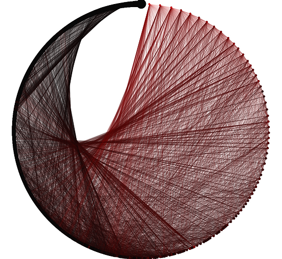 Concentrations of connections adjacent to each other through the graph are an indication of the more important cities and their clusters found in the graph, Betweenness Centrality. Likewise the concentrations of red connections connecting the first 2/3 of the cirkle graph shows the smaller cities in groups connecting to larger cities across from them in the graph.